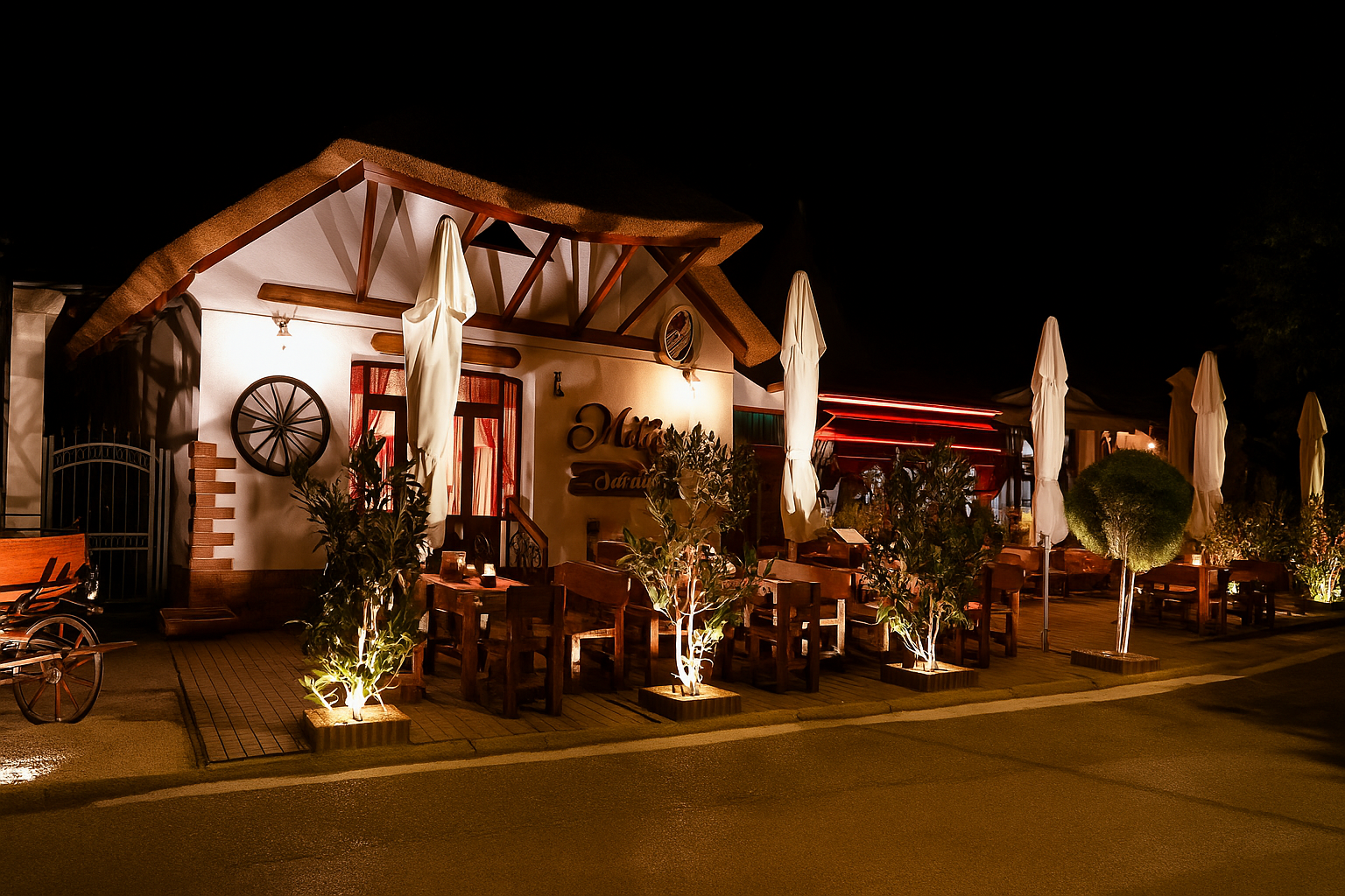 Nočný exteriér reštaurácie so stolmi pokrytými červenými obrusmi a stoličkami vonku, osvetlený teplým svetlom, s kvetináčmi a slnečníkmi pozdĺž chodníka.
