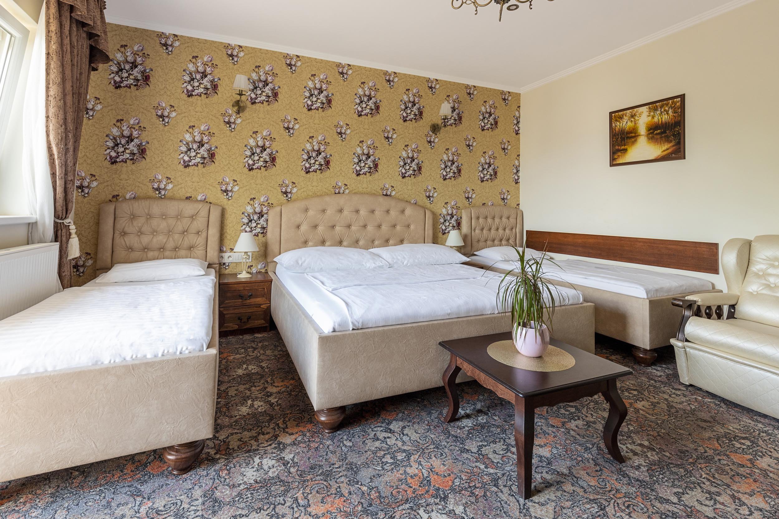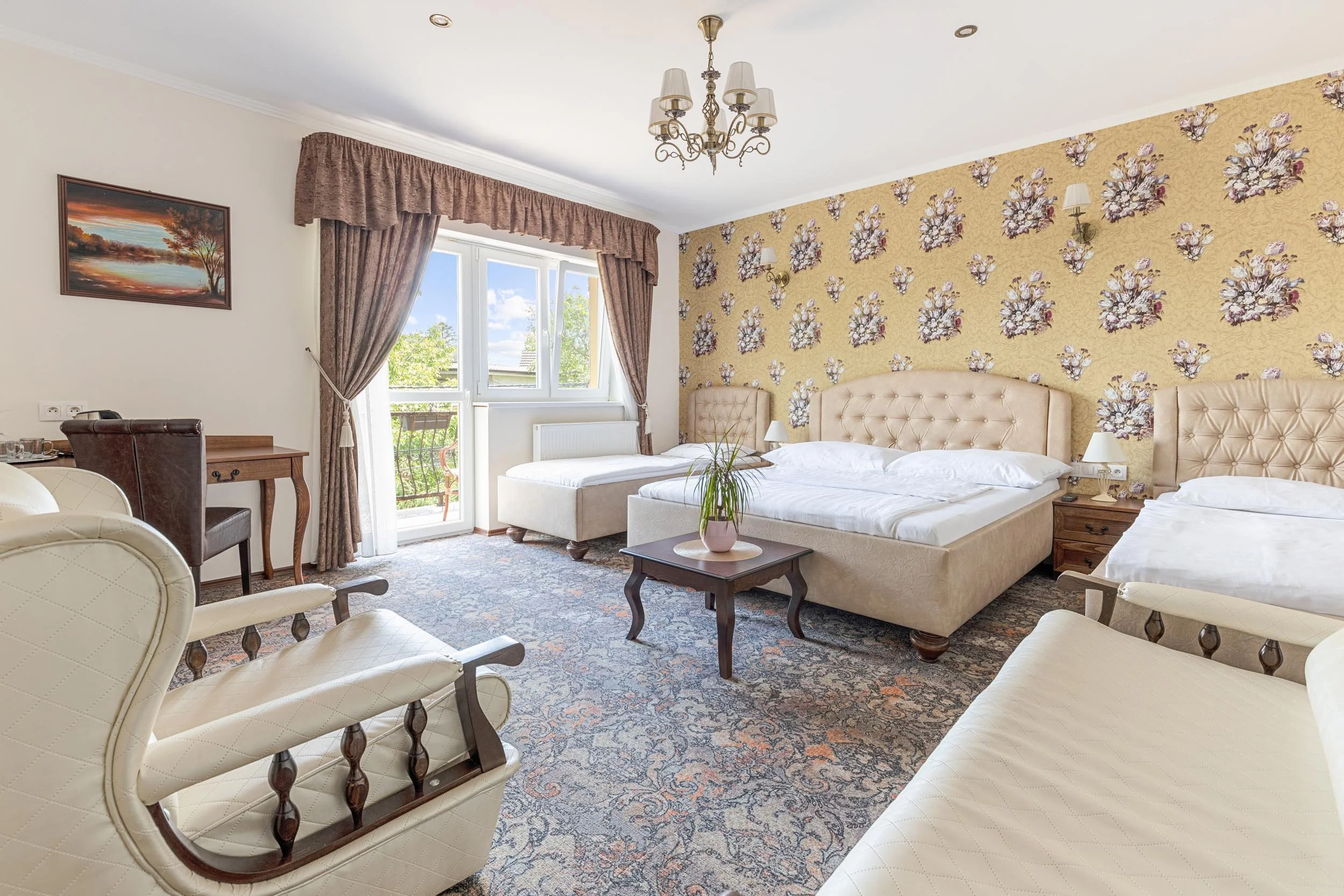 Doprajte si priestor, pohodlie a štýl. Táto elegantná izba s manželskou posteľou a dvomi samostatnými lôžkami je ako stvorená pre rodiny aj priateľov. Nechýba TV so satelitom, Wi-Fi, klimatizácia, chladnička, kanvica ani balkón, kde si vychutnáte rannú kávu.
